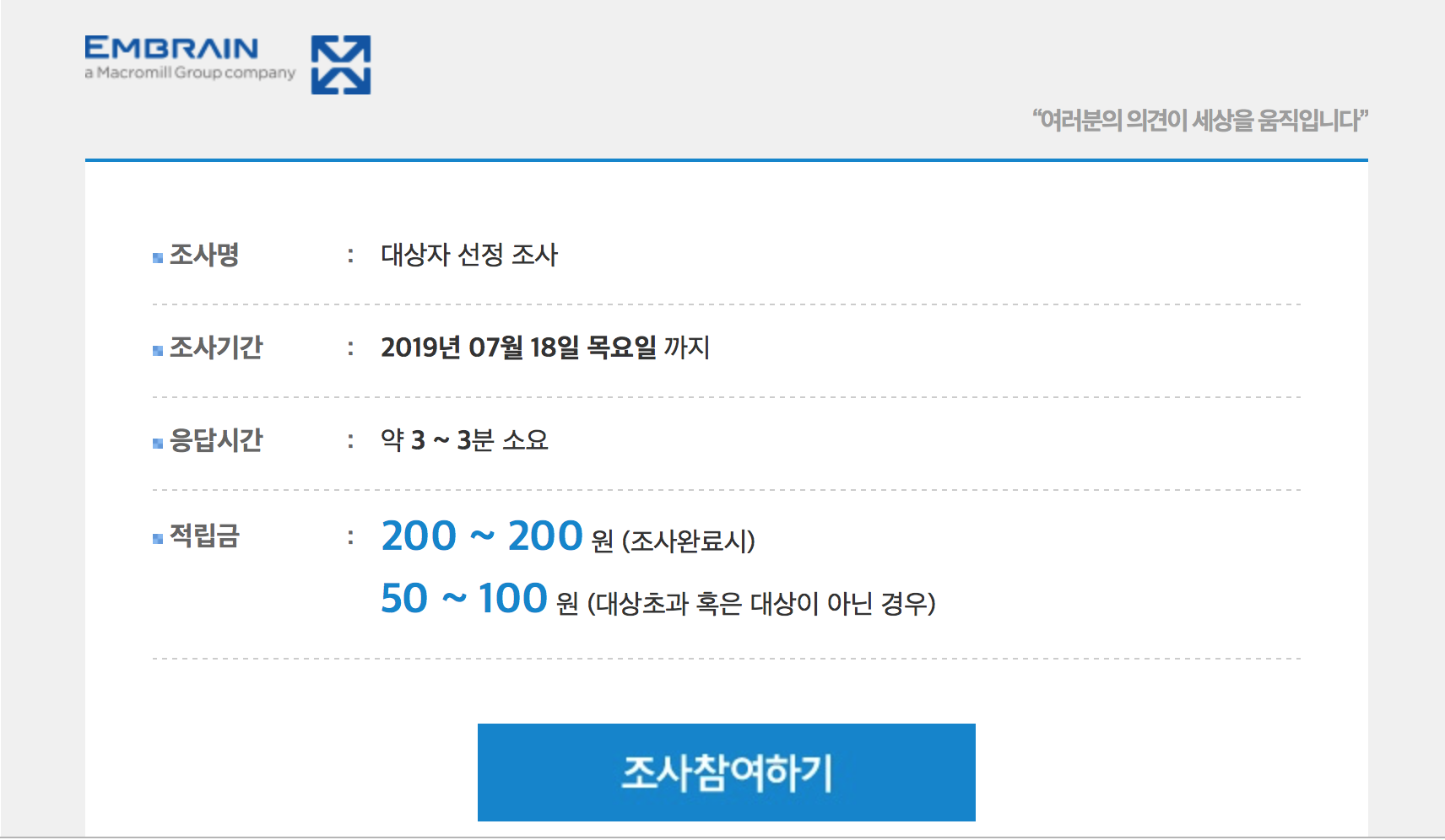 엠브레인은 또 다른 설문조사 사이트인데요. 주로 메일로 설문조사 메일이 오고 참여할 수 있습니다. 설문조사 참여 시 금액이 조금은 높기에 은근히 쏠쏠한데요. 물론 그렇게 큰돈을 버는 것은 아닙니다. 설문조사의 대상자가 아닐 경우 적립해주는 최소 금액이 50원입니다. 대신 대상자인 경우 많게는 몇 천원도 한 설문조사에서 벌 수 있고요. 좌담회도 많이 열리니 조사 대상자이시면 하루 참여하는 것도 좋을 것 같습니다. 건당 5만 원, 8만 원 등 꽤 높은 편입니다.